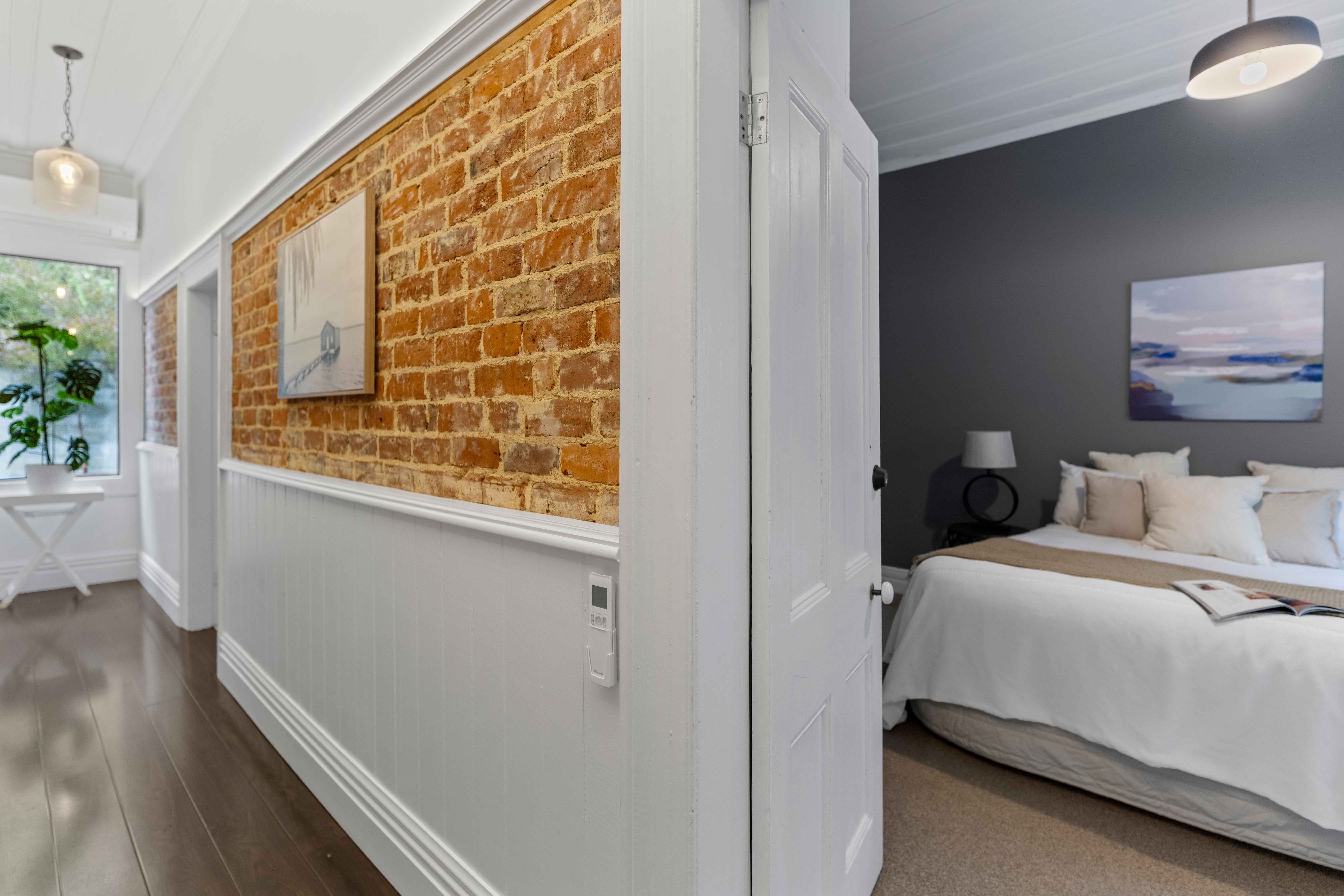 Exposed brick walls line the hallway, delivering unmistakable New York apartment energy the moment you walk through the door. The décor is beautifully curated throughout — modern, warm, and effortlessly on trend.